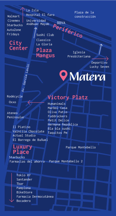 Gracias a los servicios de primer nivel ubicados estratégicamente alrededor de la privada, vivir en Matera te permite disfrutar al máximo de la exclusividad del ambiente urbano y la calidad de vida de la zona, entre plazas comerciales, restaurantes, servicios de entretenimiento y más.